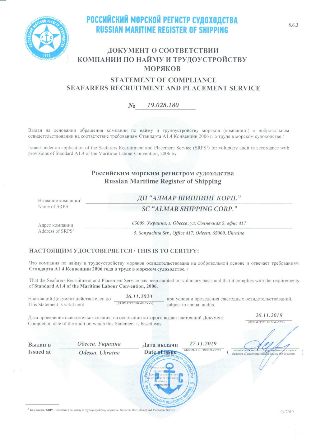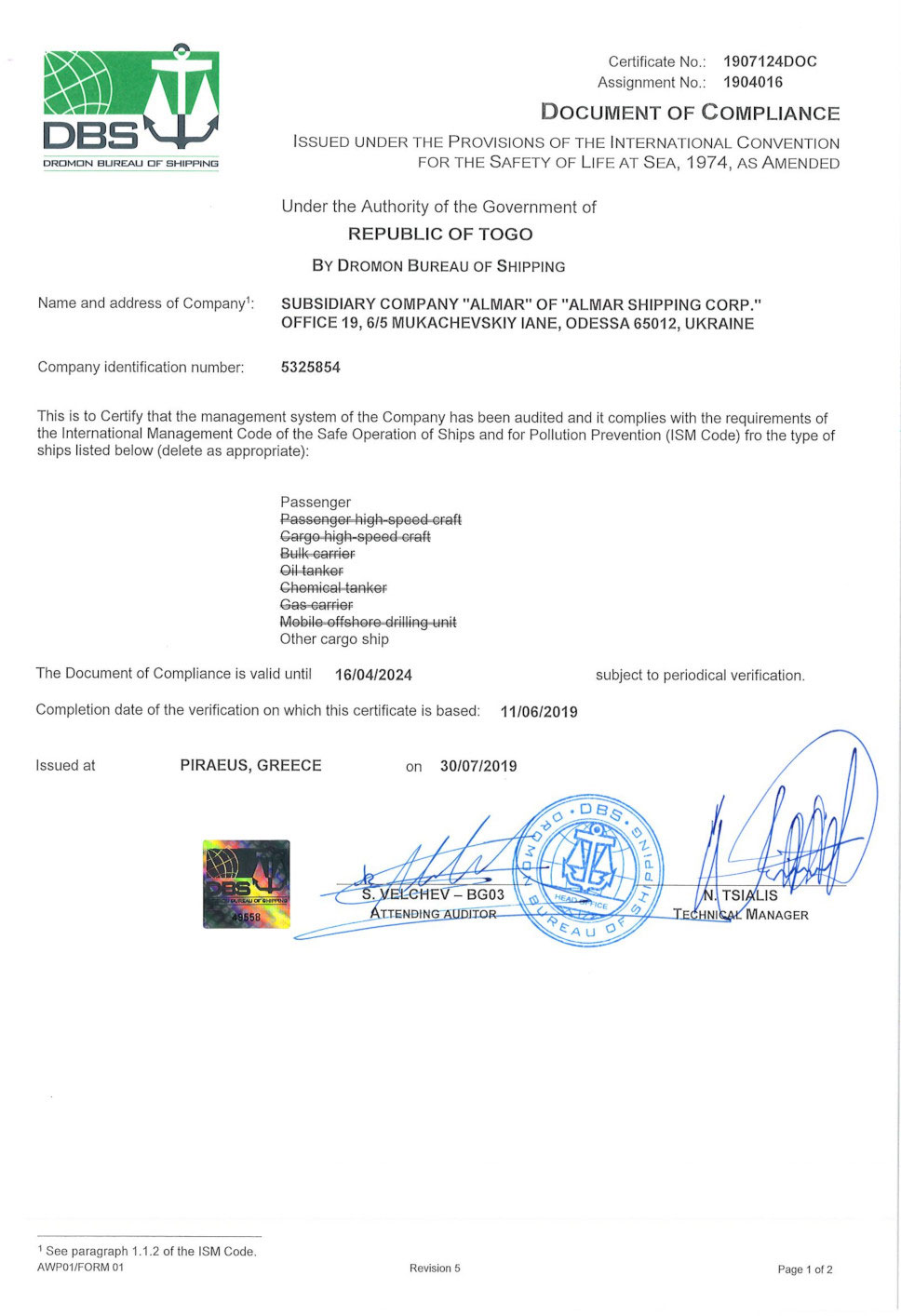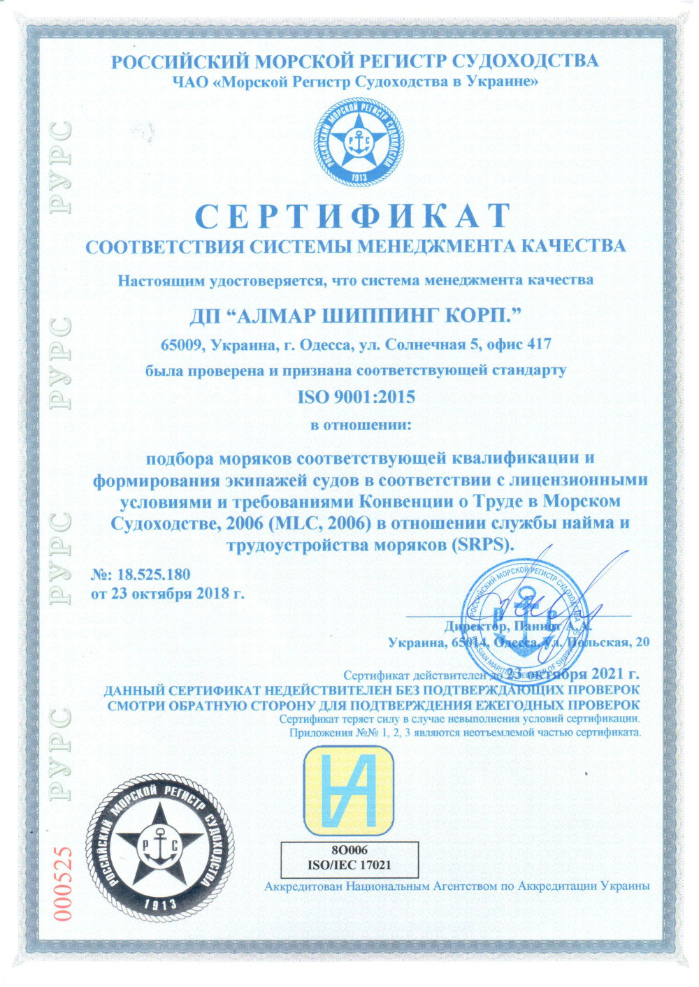 Наша компания имеет все необходимые документы и соответствия требованиям Системы управления качеством ISO 9001: 2008, сертифицирована в соответствии с требованиями Конвенции 2006 года о труде в морском судоходстве. В то же время компания предоставляет нашим клиентам высококвалифицированное техническое управление и сертифицирована на соответствие ISM Code и ISPS Code Российским морским регистром судоходства и Бюро судоходства Dromon Bureau of Shipping от имени морских администраций Того, Белиза, Сент-Китс и Невиса.